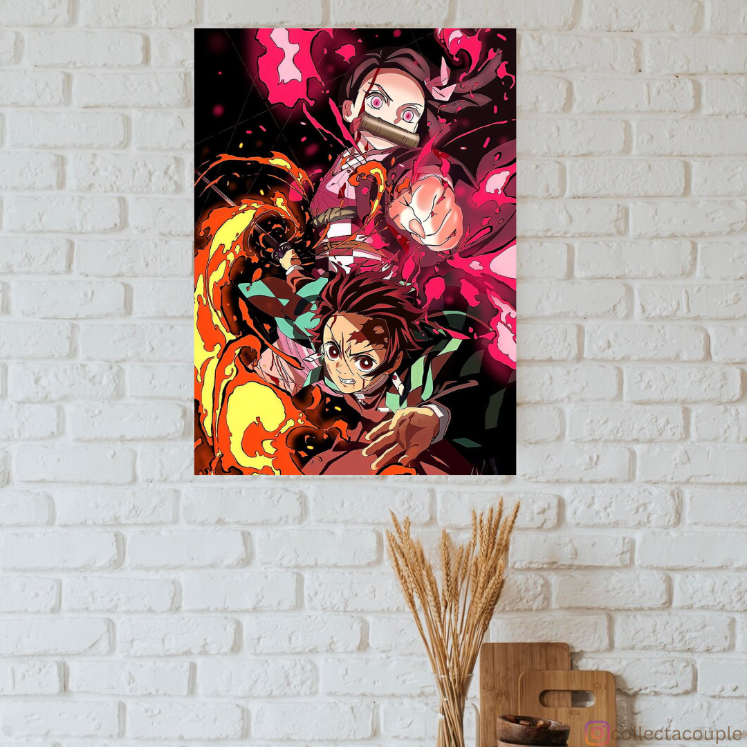 Embark on a captivating journey of bravery and familial bonds with our exclusive poster featuring Tanjiro and Nezuko, the iconic siblings from the acclaimed anime and manga series, Demon Slayer: Kimetsu no Yaiba. This artwork celebrates the unbreakable bond between brother and sister as they navigate a world filled with demons, danger, and the quest for redemption.