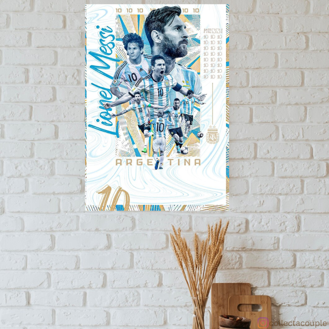 Celebrate the brilliance of Lionel Messi, one of football's greatest talents, with our captivating collage poster showcasing his iconic moments representing Argentina. From his early days as a rising star to his legendary status as a football maestro, Messi's journey with the Argentina national team has been marked by breathtaking goals, mesmerizing skills, and unwavering dedication to his country. Join us as we pay tribute to Messi's illustrious career and his enduring impact on the world of football.