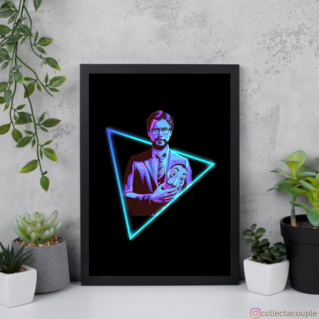 Illuminate your space with the brilliance of our Money Heist The Professor Neon Poster, featuring a striking neon design of the mastermind behind the heist, The Professor, bringing a bold and electrifying vibe.