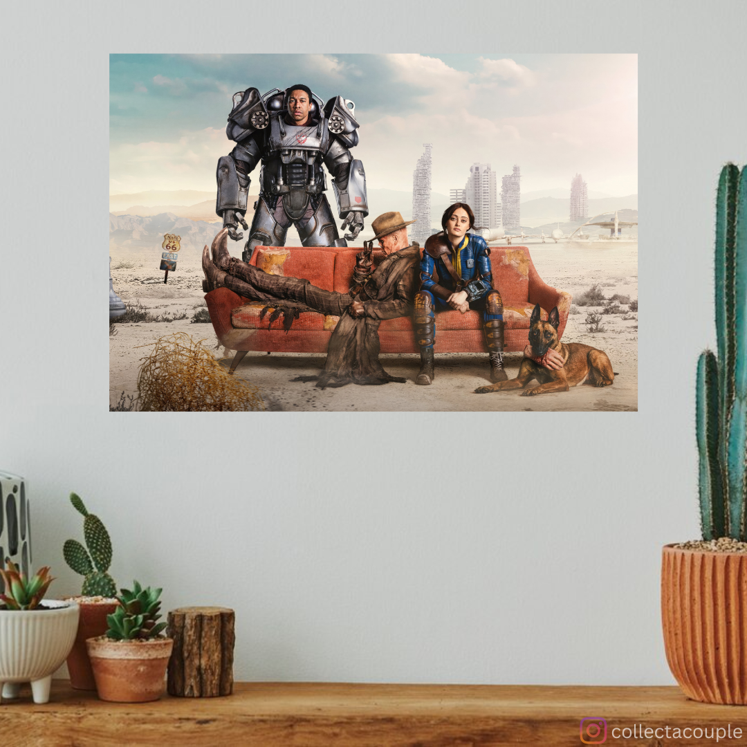 Immerse yourself in the post-apocalyptic world of Fallout with our exclusive Fallout Trio Poster. Featuring iconic scene from the beloved video game series, this poster brings the dystopian charm of Fallout alive along with your favourite characters.