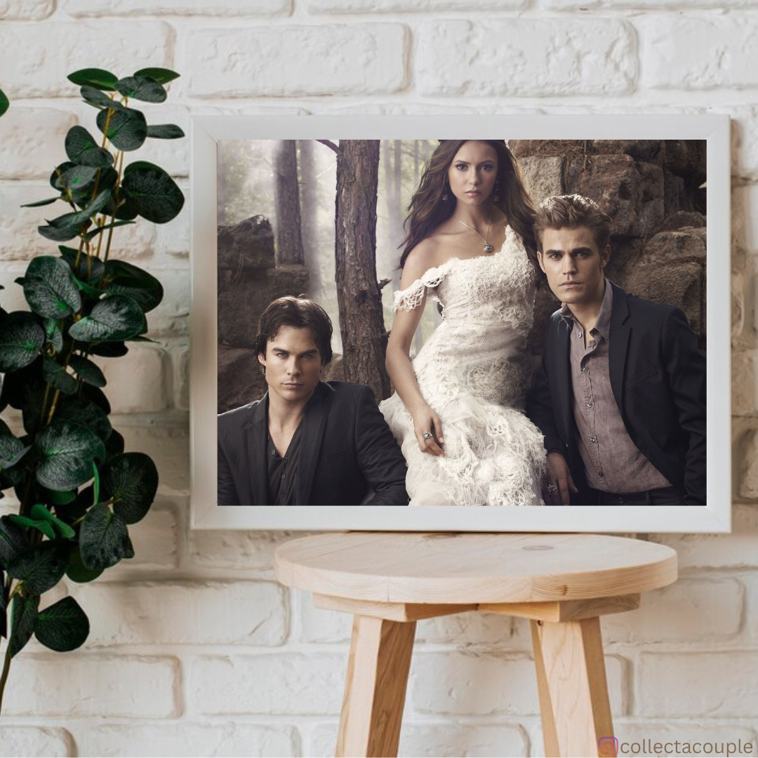Dive into the mystical world of "The Vampire Diaries" with our stunning Trio Poster, featuring the iconic characters Elena, Damon, and Stefan, capturing the intense emotions and captivating dynamics of the beloved series, showcasing the trio's unforgettable chemistry and dramatic storyline.