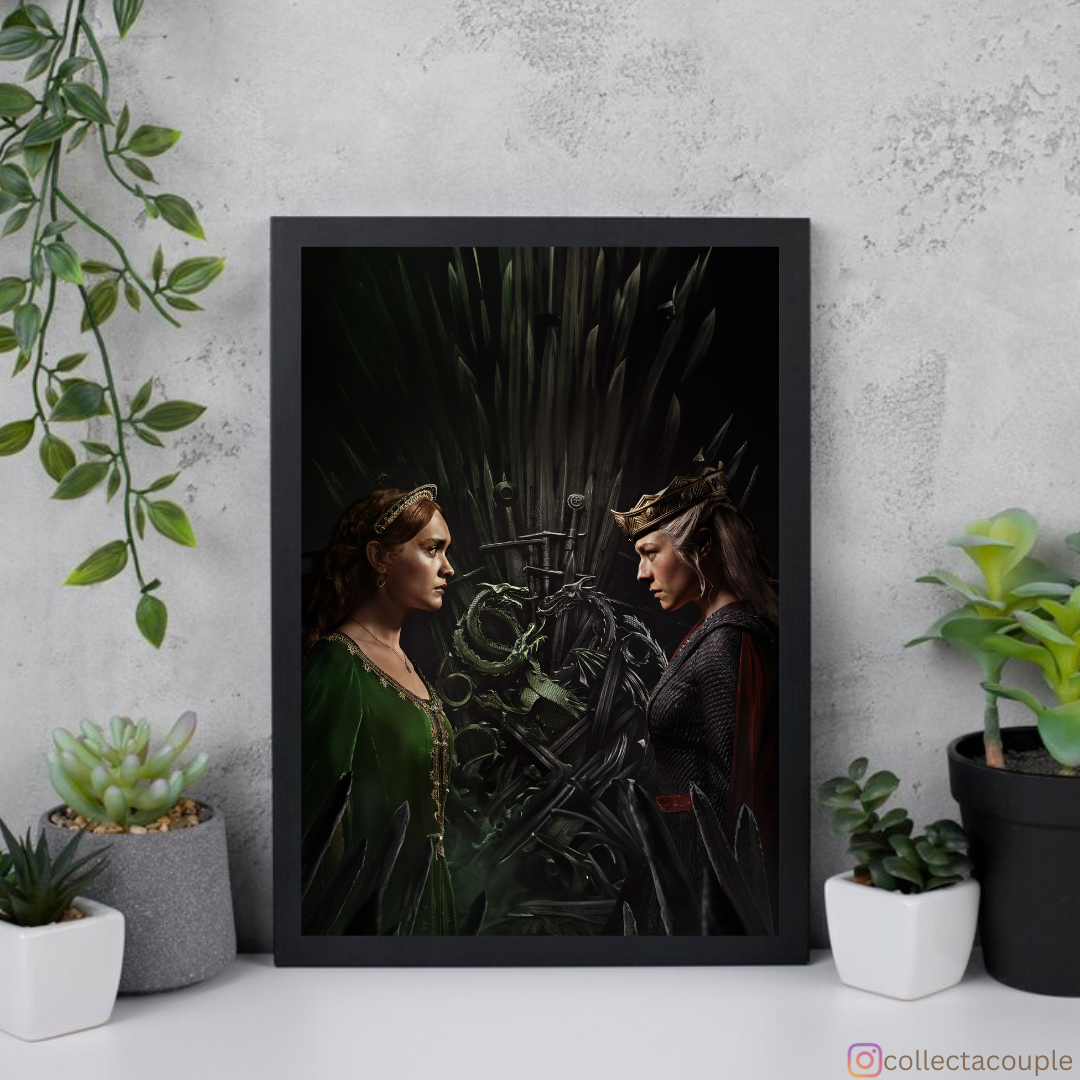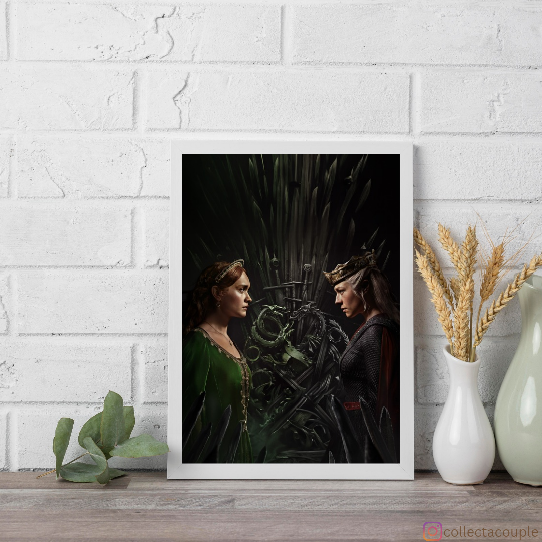 Immerse yourself in the intrigue and drama of Westeros with our exclusive Rhaenyra & Alicent Poster. Inspired by the captivating characters from the hit series "House of the Dragon," this poster beautifully captures the complex relationship between Princess Rhaenyra Targaryen and Queen Alicent Hightower.