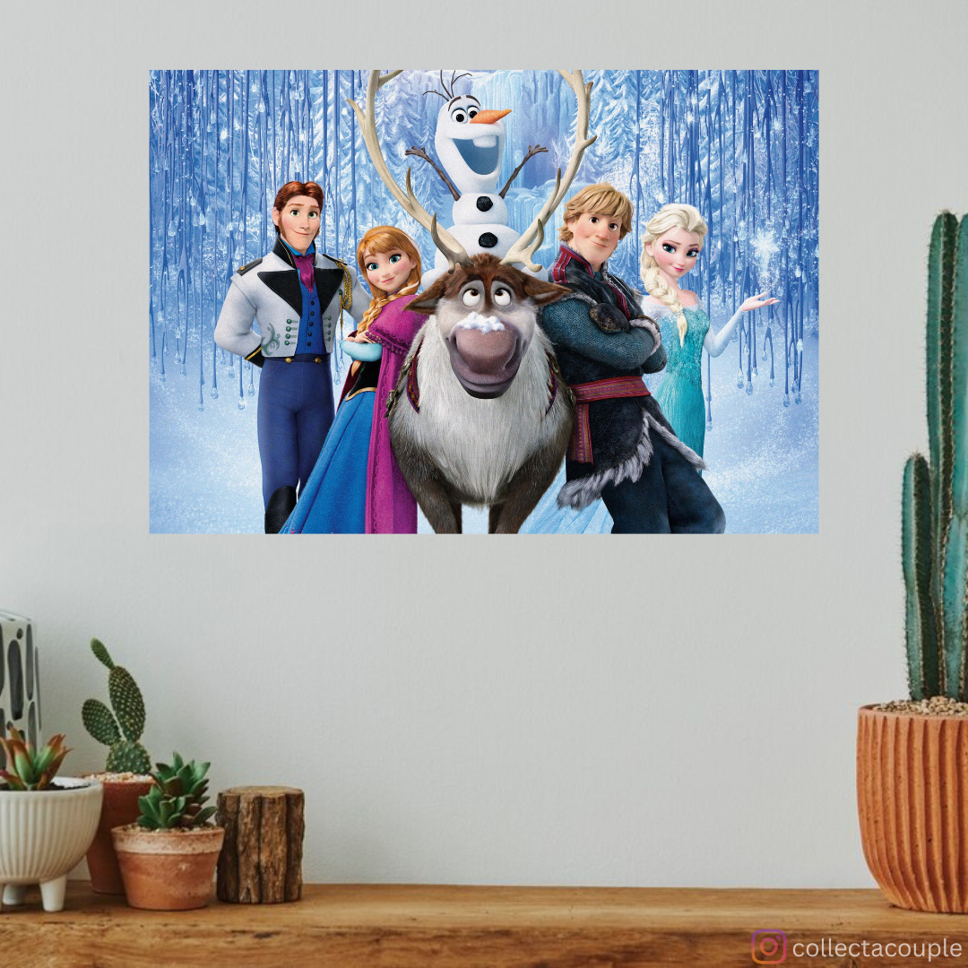 Dive into the enchanting world of Arendelle with our Frozen Cast Poster, featuring your favorite characters from Disney's beloved animated film. This poster beautifully captures the magic and adventure of Elsa, Anna, Olaf, Kristoff, and Sven.
