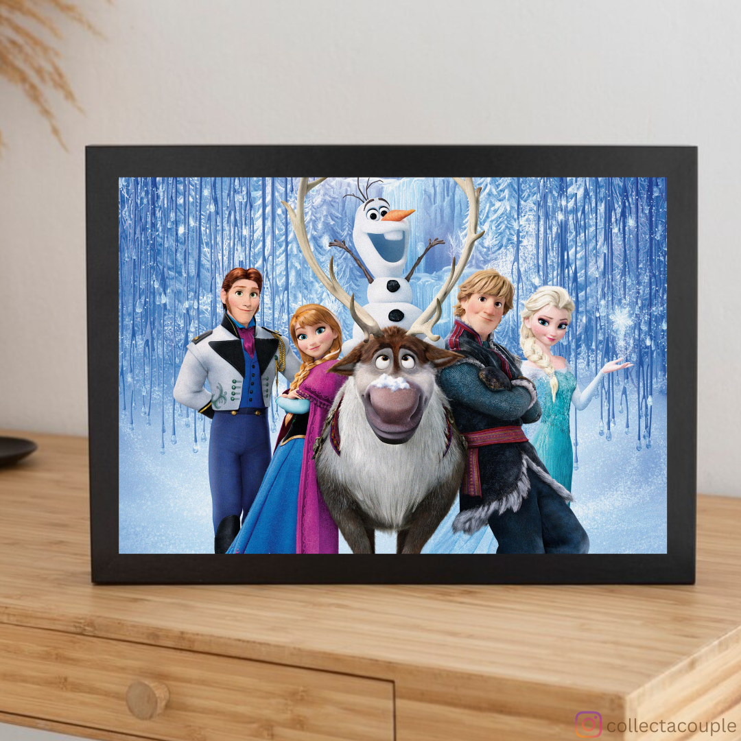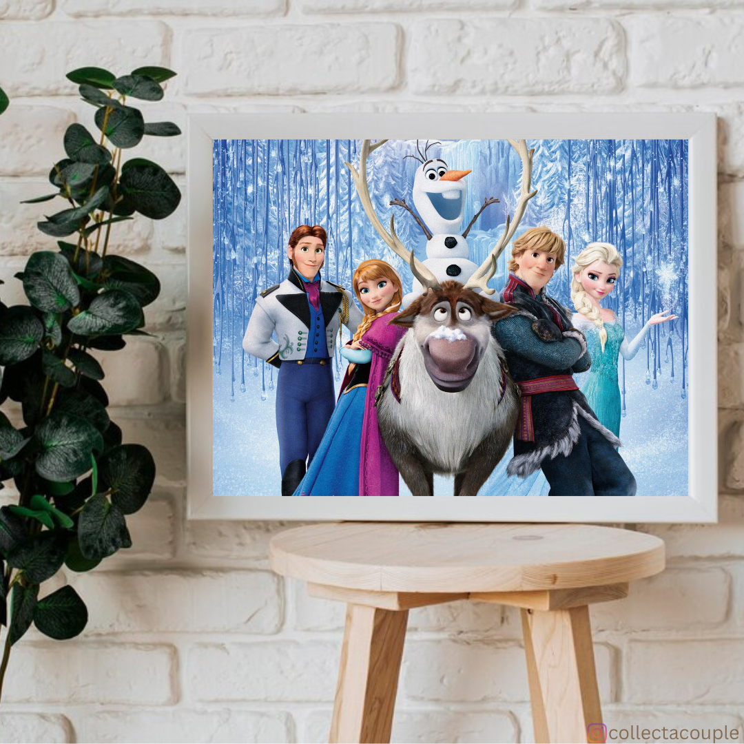 Dive into the enchanting world of Arendelle with our Frozen Cast Poster, featuring your favorite characters from Disney's beloved animated film. This poster beautifully captures the magic and adventure of Elsa, Anna, Olaf, Kristoff, and Sven.