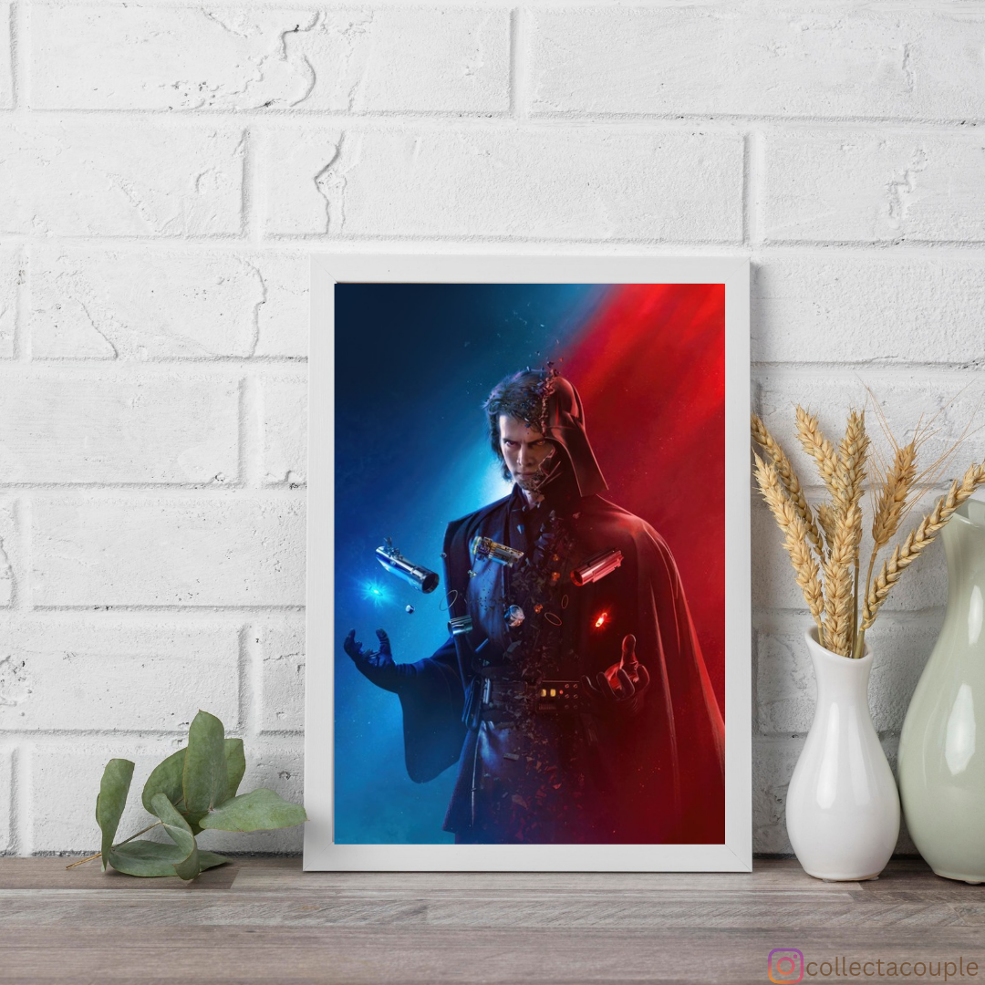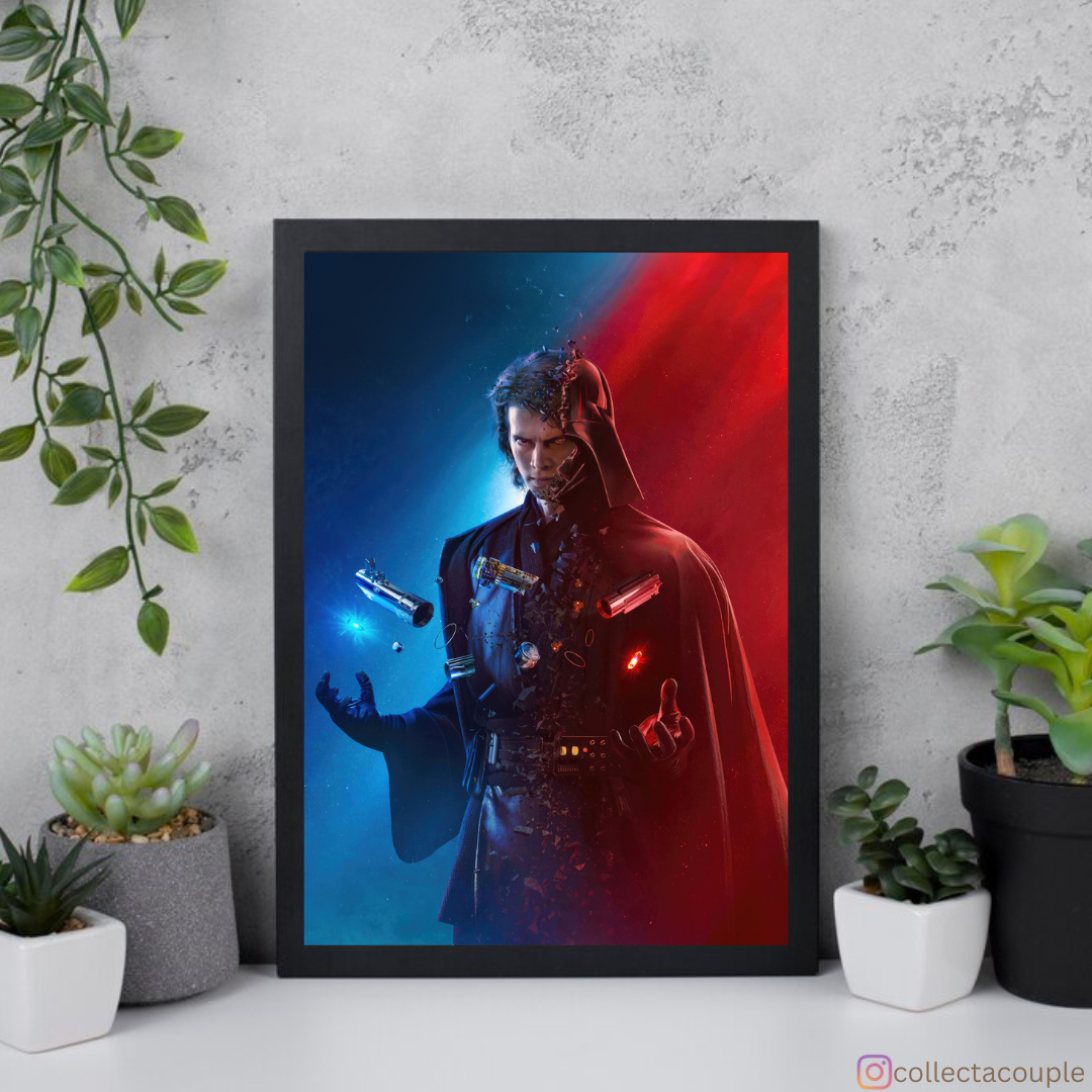 Experience the duality of the Star Wars saga with our Anakin and Darth Vader Split Poster. This stunning piece of art captures the transformation from the heroic Anakin Skywalker to the formidable Darth Vader, symbolizing the epic journey of one of the most iconic characters in cinema history.