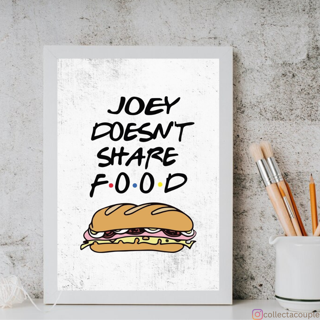Indulge in the comedic antics of Joey Tribbiani with our exclusive Friends poster, capturing one of the most iconic moments from the beloved sitcom. Featuring Joey's infamous declaration, "Joey Doesn't Share Food," this artwork is a humorous tribute to the lovable yet self-absorbed character and his unwavering commitment to his culinary delights.
