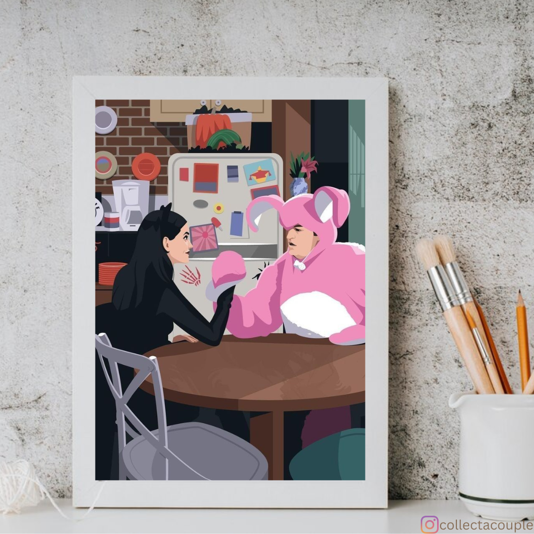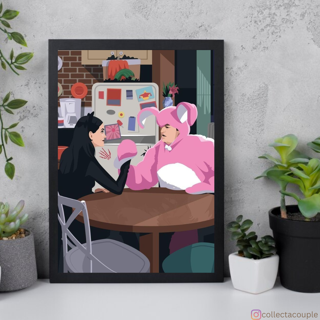 Step into the spooky and hilarious world of Monica and Chandler's Halloween Party with our exclusive animated Friends poster. Featuring the beloved characters from the iconic sitcom in their most memorable costumes, this artwork brings to life the festive atmosphere and playful antics of one of the most unforgettable episodes from the series.