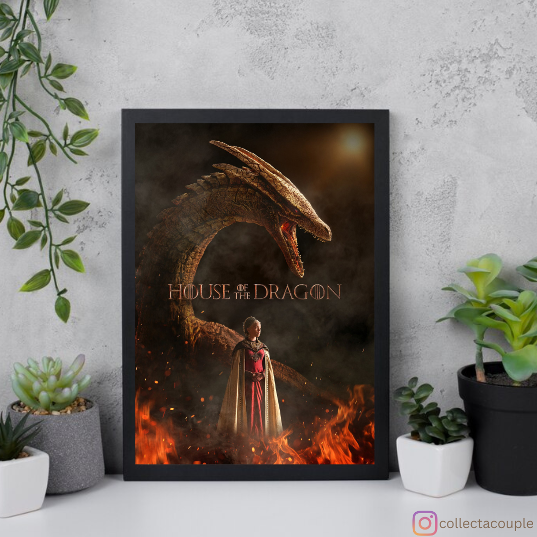 Prepare to be enthralled by the fiery spirit of House Targaryen with our captivating poster featuring Rhaenyra Targaryen, a central figure in the upcoming series "House of the Dragon." As the first-born daughter of King Viserys I Targaryen, Rhaenyra embodies the legacy, ambition, and tumultuous history of her legendary family. Step into the world of Westeros and witness the rise of a dragon queen whose destiny is entwined with power, passion, and betrayal.