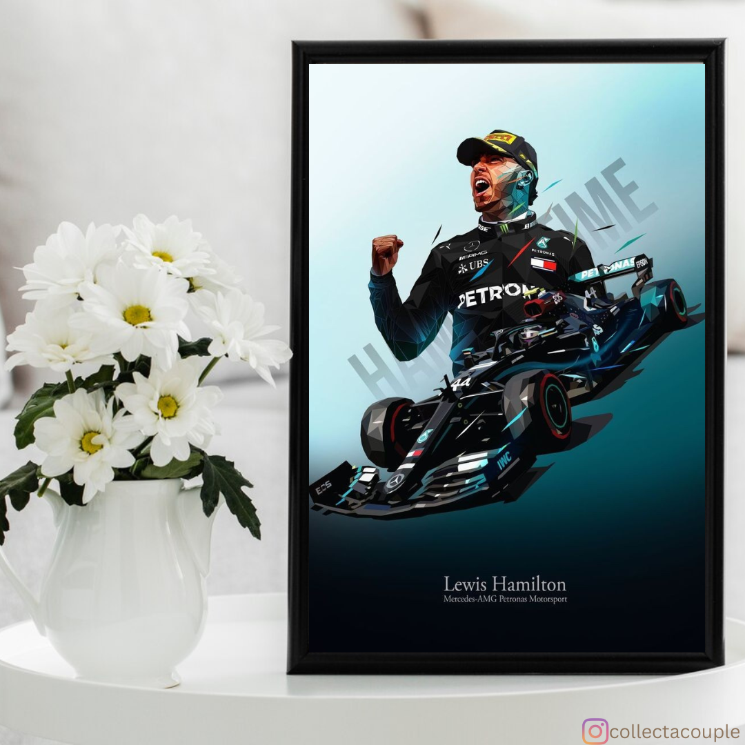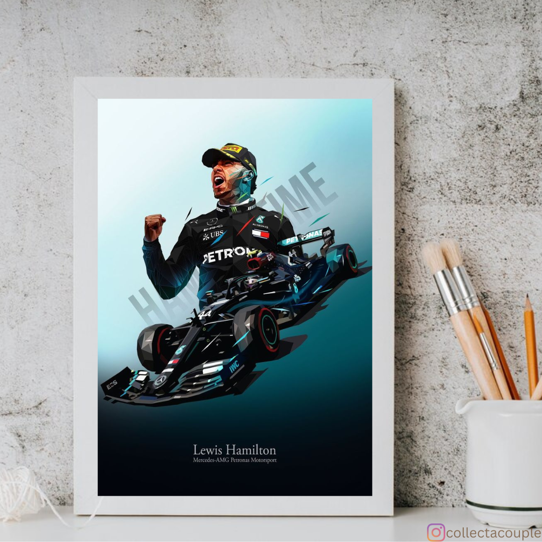 Celebrate the exhilarating triumphs of racing legend Lewis Hamilton with our dynamic poster capturing his iconic win pose. As one of the most successful and influential Formula One drivers in history, Hamilton's victories on the track are marked by moments of sheer excitement, determination, and unparalleled skill. Join us as we pay homage to Hamilton's unmatched talent and celebrate the thrill of victory with this captivating poster.