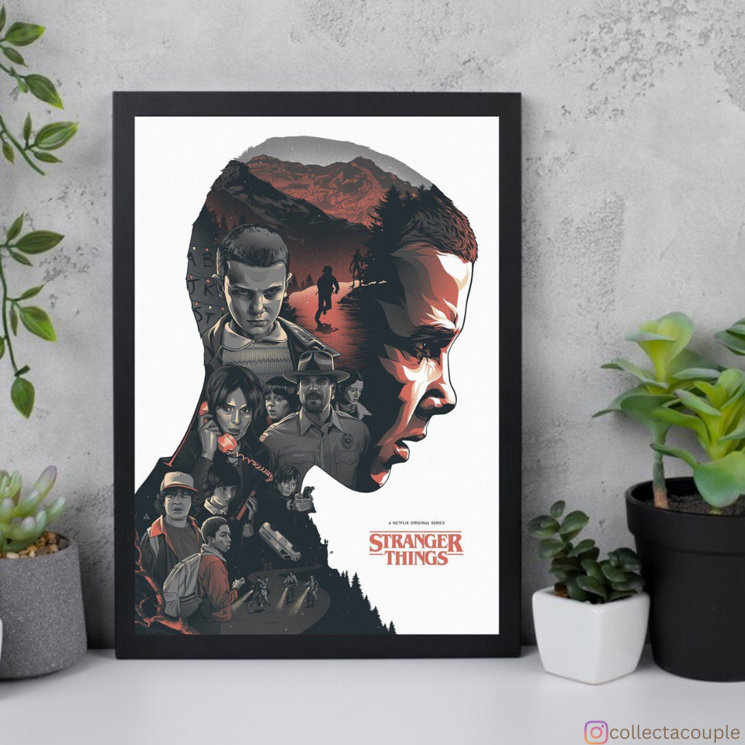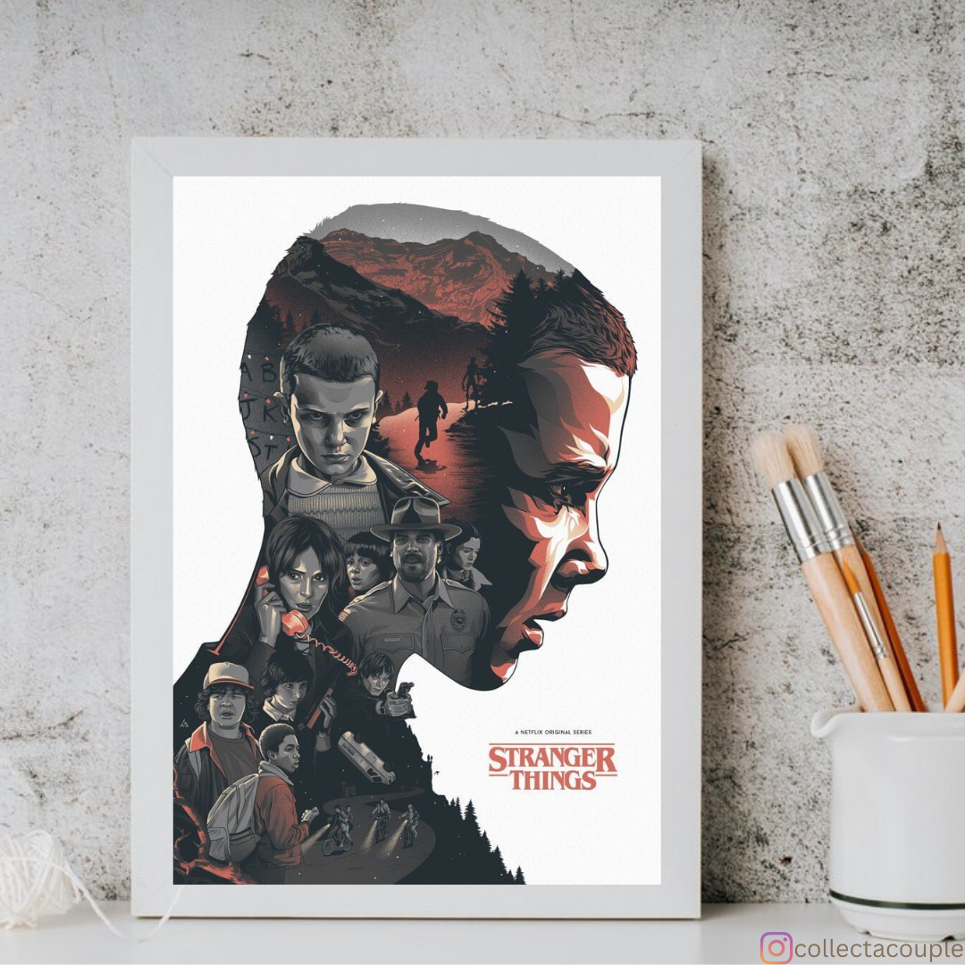 Dive into the enigmatic world of Hawkins, Indiana, with our mesmerizing "Stranger Things: Eleven Collage" poster, celebrating the extraordinary journey of the telekinetic girl known as Eleven. Immerse yourself in the haunting atmosphere, nostalgic charm, and supernatural intrigue of the hit Netflix series as we pay tribute to one of its most iconic characters. Whether you're a fan of Eleven's mysterious powers or simply captivated by the allure of the Upside Down, our artwork invites you to explore the depths of Eleven's character.