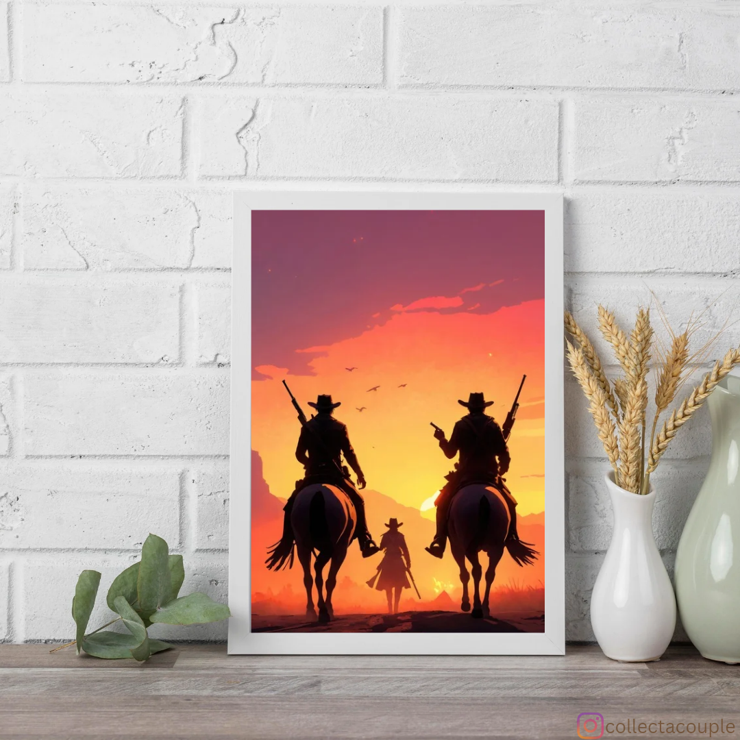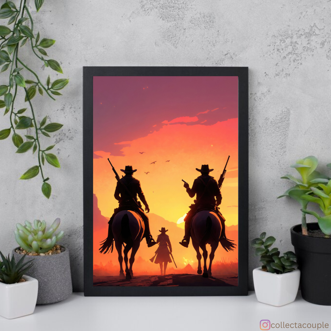 Immerse yourself in the rugged world of the Wild West with our exclusive Scenic Poster from Red Dead Redemption II, capturing the essence of the legendary outlaw, riding horses and showcasing his stoic determination & frontier spirit with a scenic backdrop.