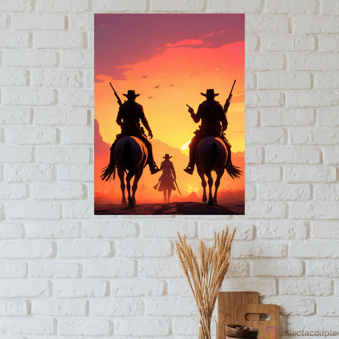 Immerse yourself in the rugged world of the Wild West with our exclusive Scenic Poster from Red Dead Redemption II, capturing the essence of the legendary outlaw, riding horses and showcasing his stoic determination & frontier spirit with a scenic backdrop.
