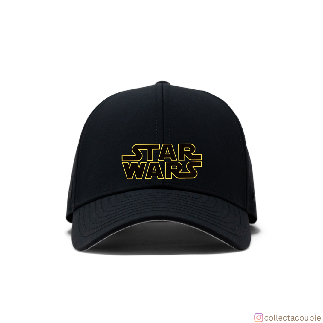The "Star Wars" logo is an iconic emblem representing one of the most influential and beloved franchises in cinematic history. The logo features the title "Star Wars" in bold, yellow lettering set against a tilted perspective, with a backdrop of stars that evoke a sense of epic space adventure.