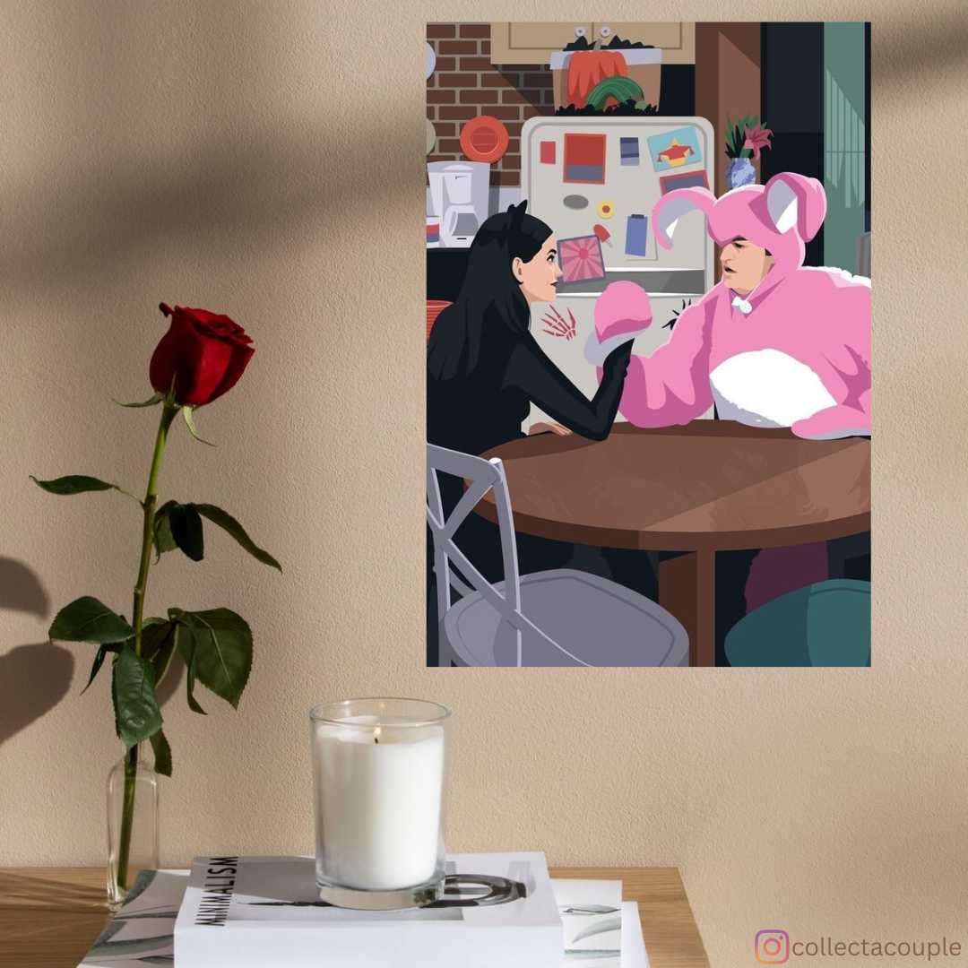 Step into the spooky and hilarious world of Monica and Chandler's Halloween Party with our exclusive animated Friends poster. Featuring the beloved characters from the iconic sitcom in their most memorable costumes, this artwork brings to life the festive atmosphere and playful antics of one of the most unforgettable episodes from the series.