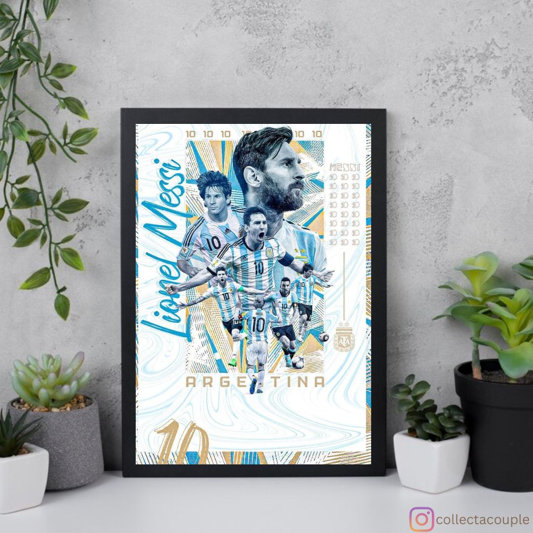Celebrate the brilliance of Lionel Messi, one of football's greatest talents, with our captivating collage poster showcasing his iconic moments representing Argentina. From his early days as a rising star to his legendary status as a football maestro, Messi's journey with the Argentina national team has been marked by breathtaking goals, mesmerizing skills, and unwavering dedication to his country. Join us as we pay tribute to Messi's illustrious career and his enduring impact on the world of football.