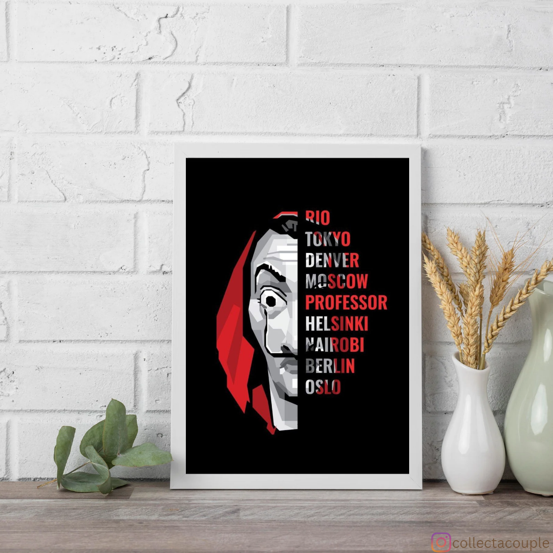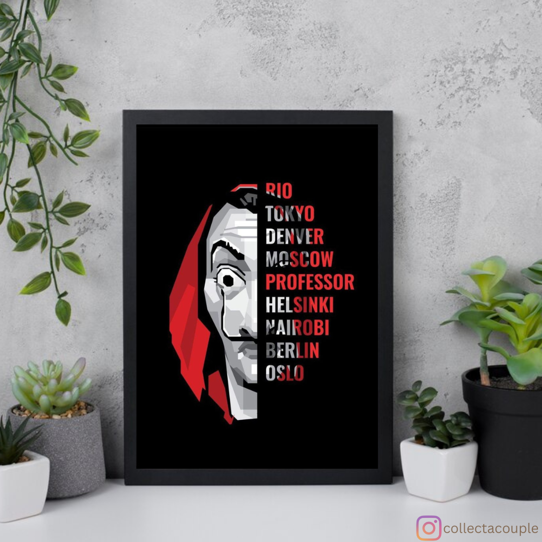 Enter the dual worlds of heroism and betrayal with our compelling "Money Heist: Split Face" poster, a visual representation of the intricate interplay between the characters' identities, motivations, and allegiances in the acclaimed Spanish television series. As the heist unfolds, lines between right and wrong blur, and each character must confront their inner demons and wrestle with the consequences of their actions. Join us as we explore the complexities of the human psyche in this gripping artwork.